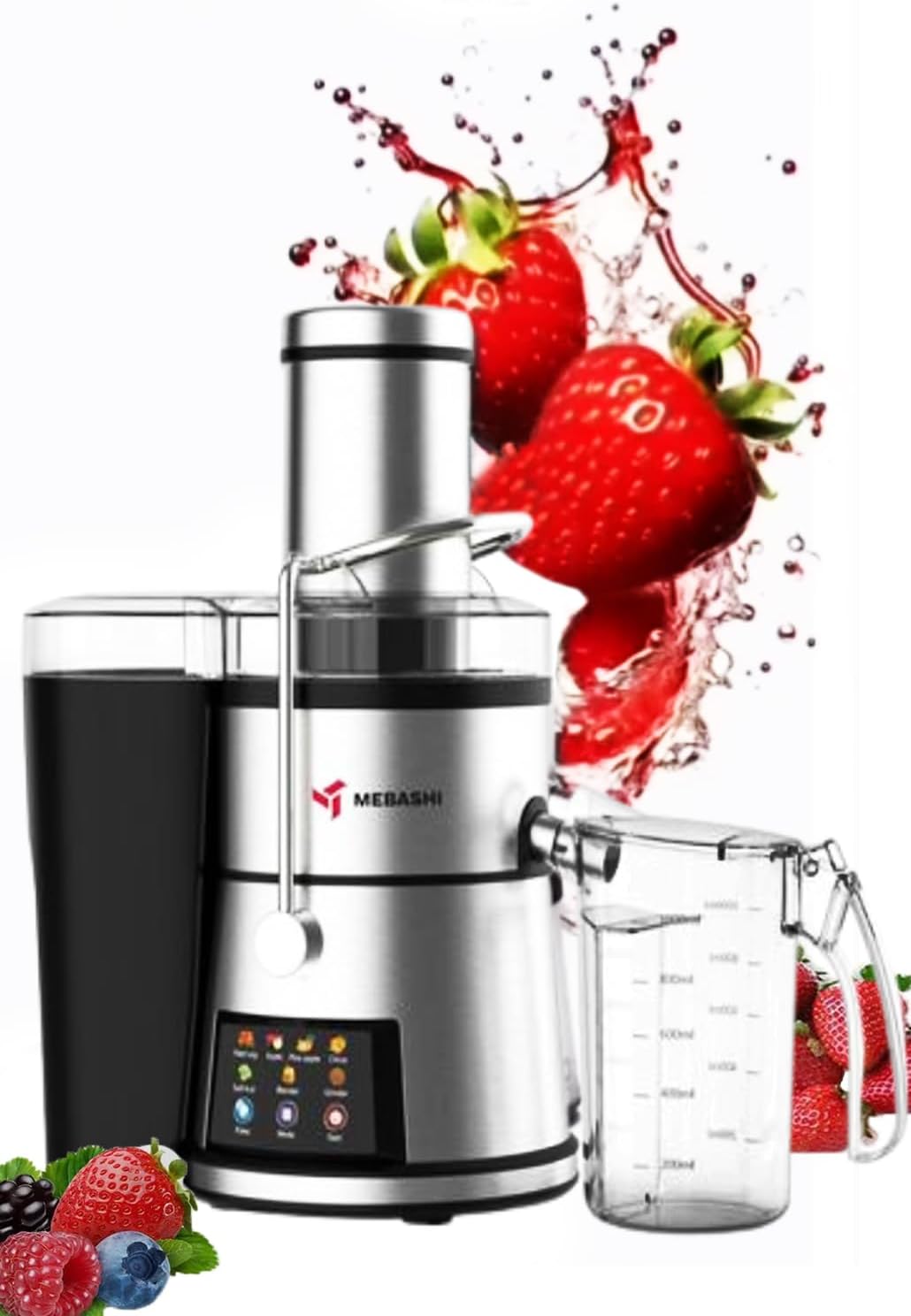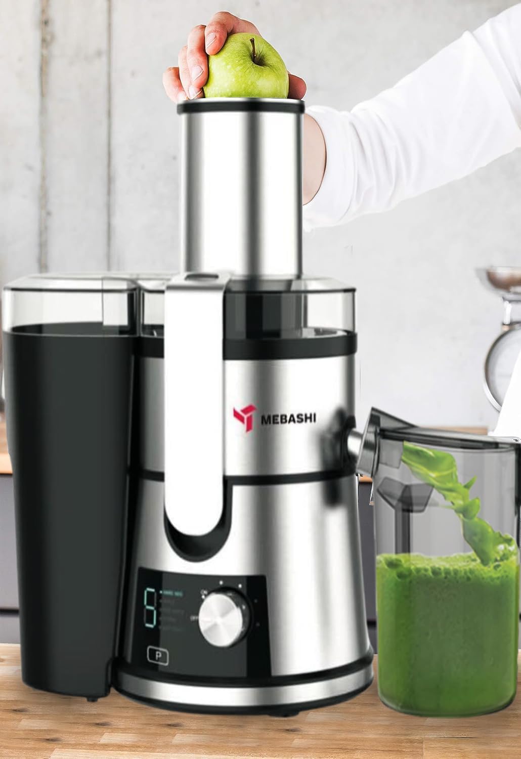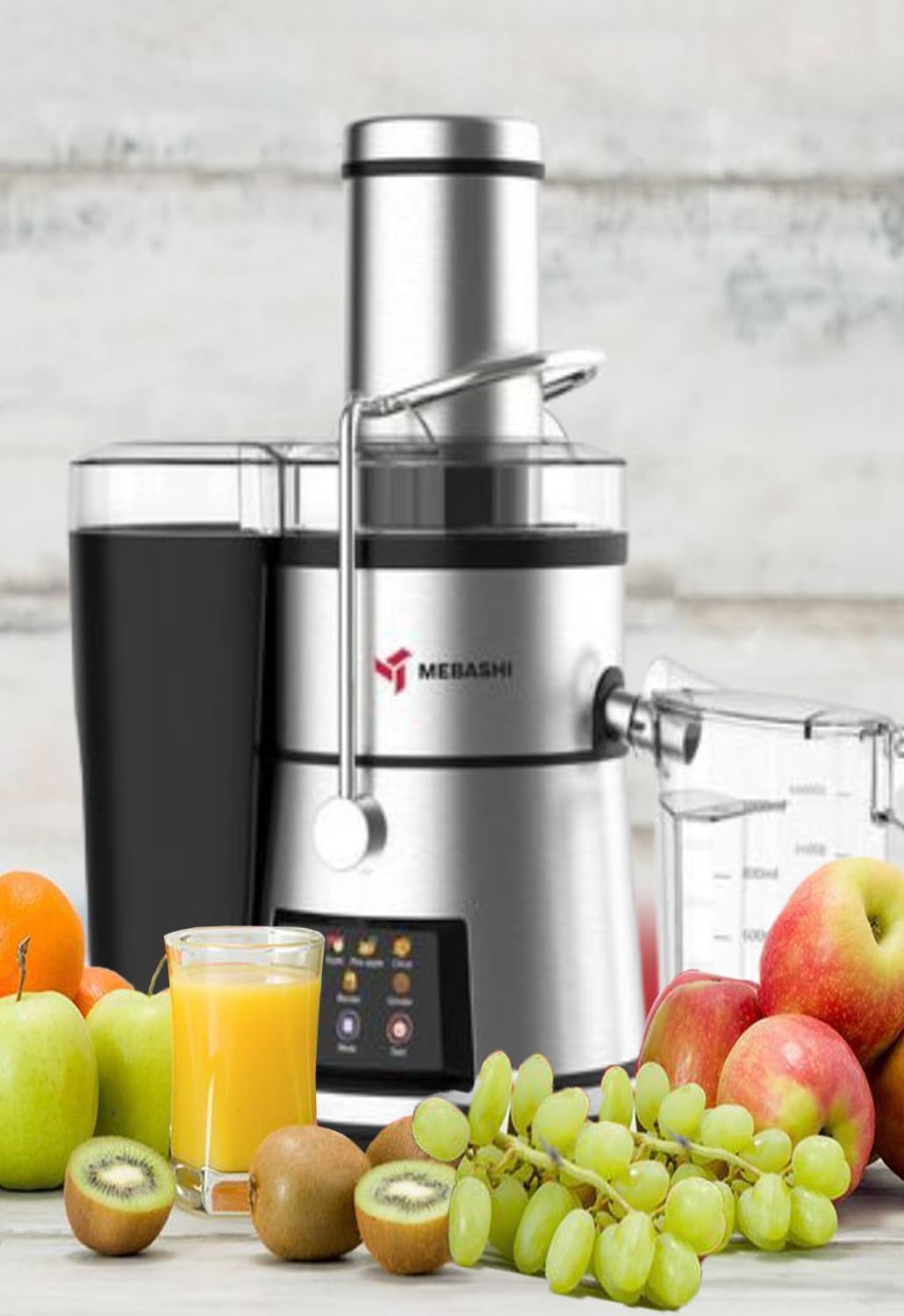 آبمیوه گیری 4 کاره مباشی مدل ME-JB2012 با توان 800 وات و دهانه 85 میلیمتری. شامل مخلوطکن شیشهای 1.5 لیتری، آسیاب و خردکن. 5 سطح سرعت دیجیتال.