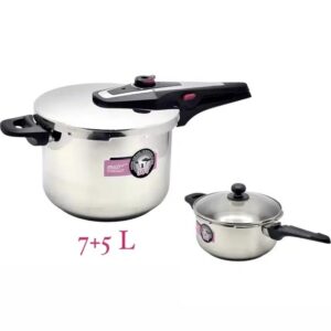 - ظرفیت دوگانه: شامل دو قابلمه زودپز با اندازههای ۷ لیتر و ۵ لیتر است. این ظرفیتها پخت غذا برای خانوادههای بزرگ یا مهمانیهای کوچک را تسهیل میکنند.