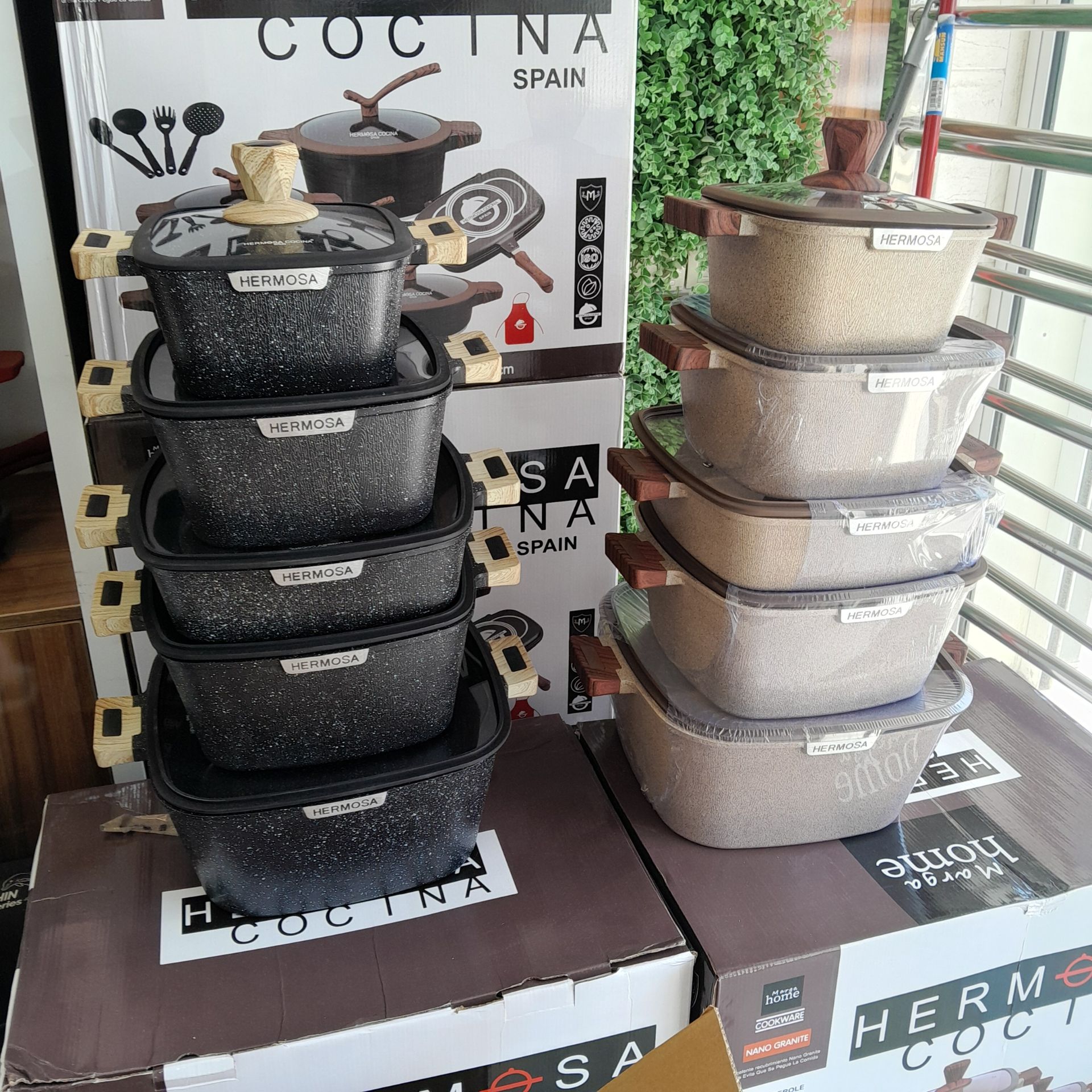 سرویس قابلمه 10 پارچه گرانیتی مربعی هرموسا (HERMOSA) با طراحی شیک اسپانیایی و دستههای طرح چوب. روکش گرانیتی نچسب و ضدخش برای آشپزی سالم و سریع. شامل ۴ قابلمه و تابه در سایزهای پرکاربرد.